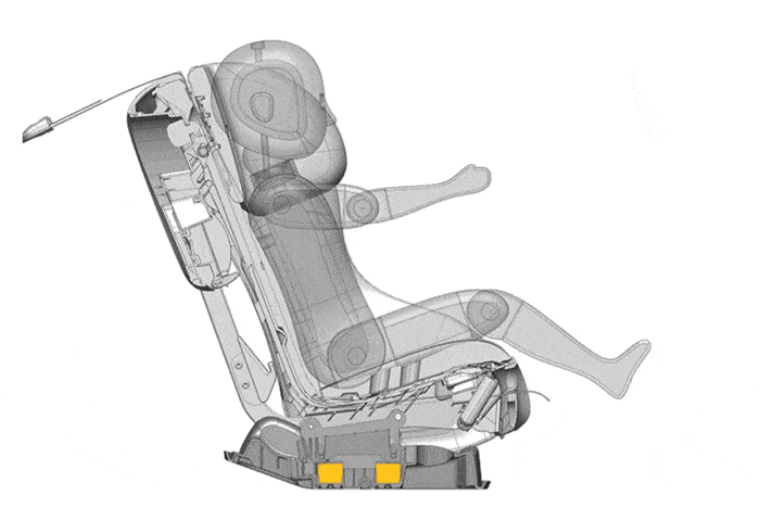 During a frontal collision, this design forces the seat frame to move relative to the base, crushing the honeycomb deformable cores and absorbing energy in the process.