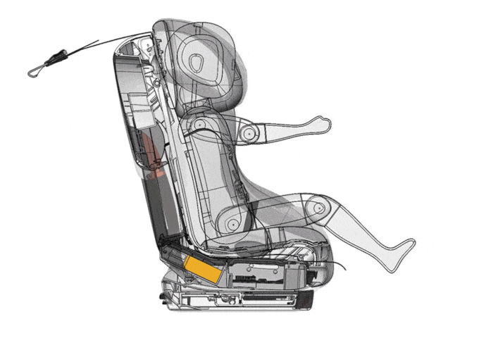 During a frontal collision, Fllo moves relative to the vehicle seat in a forward/downward motion as it compresses the foam in the vehicle seat. As it moves, the honeycomb deformable cores between the seat frame and seat base are crushed, absorbing energy in the process.